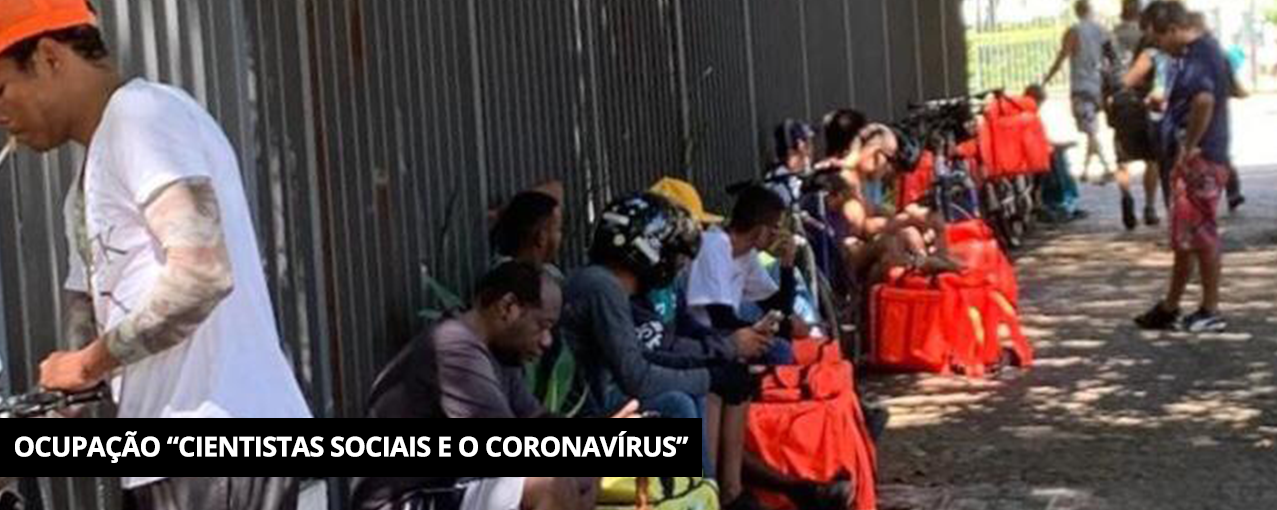 Foto da chamada: Entregadores de aplicativos esperando na calçada. Crédito: Leonardo Cassano. | Conta com tarja preta, no canto inferior esquerdo, escrito Ocupação "Cientistas sociais e o Coronavírus" em branco.