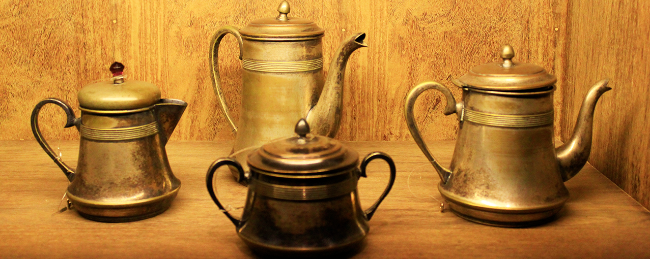 Um conjunto de chá composto de quatro peças está exposto atualmente no módulo 4 da exposição de longa duração do Museu da Imigração. Trata-se de dois bules, uma leiteira e um açucareiro. Em nossos registros, não possuímos quase nenhuma informação sobre ele, a não ser que pertenceu à antiga Hospedaria de Imigrantes do Brás. O desgaste do material revela que essas peças foram usadas frequentemente. Uma delas, inclusive, apresenta uma pequena pedra no lugar do pegador sobre a tampa — uma provável substituição após o original ter se soltado.