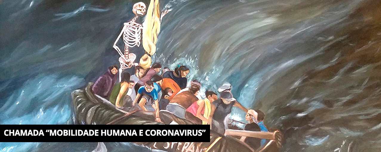 Foto da chamada: "La Balsa". Óleo sobre tela. 60X80cm. Crédito: D. Akokán, 2021. | Conta com tarja preta, no canto inferior esquerdo, escrito CHAMADA "MOBILIDADE HUMANA E CORONAVÍRUS" em branco.