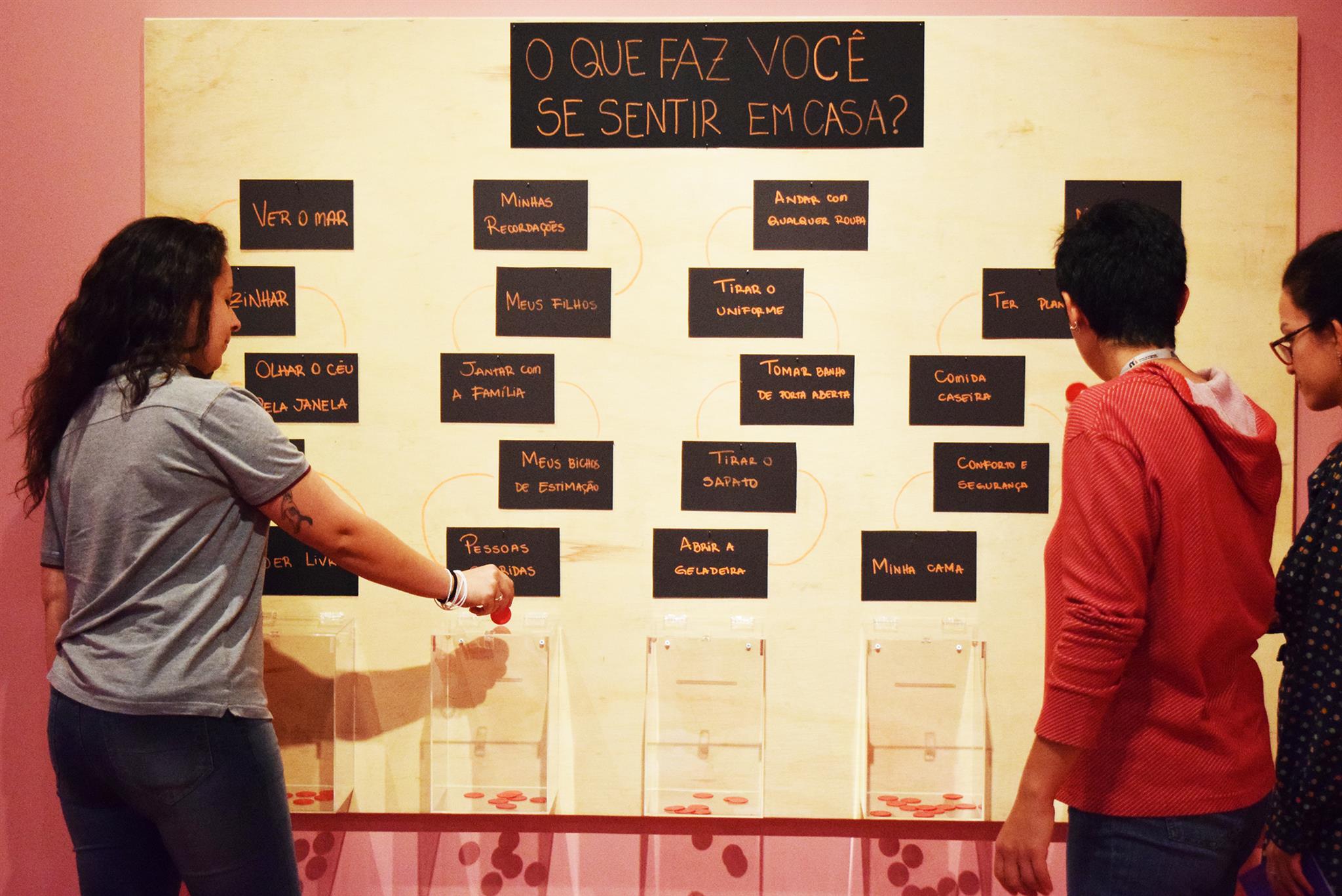 A casa pode ser ainda um vínculo, um afeto. E por isso, sentir-se em casa pode significar reconhecer-se parte de um lugar, estreitando laços humanos de conforto e apoio. Mas, afinal, que sentidos a casa pode ter para quem migra? Estruturada nos eixos Acolhida, Habitar e Morada, a exposição explora as múltiplas relações entre a experiência de migrar e a casa, como espaço e como conceito.